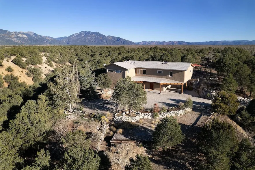 This secluded three-acre property is located high in the Sandia Canyon neighborhood, at the end of a private road, just 10 minutes North of Taos between El Prado and Arroyo Hondo. It s just a short distance to the Hondo Seco Road to get over to Taos Ski Valley. The two-story custom home is adjacent to thousands of acres of Taos Pueblo lands. Set among large pinon and juniper trees, the winding river rock planters, stairs and patio beautify the areas surrounding the house. Wildlife regularly passes through the property. Approaching the home from the driveway, a rock wall leads up to the front of the house and portal which has uninterrupted views of the Western sunsets. Two units have a separate front entry under the portal, private interior staircases and back doors open to the sheltered outdoor living spaces. The main residence is a two bedroom, two bath. The home has an attached one bedroom, one bath guest unit, perfect for a vacation rental or caretaker quarters. Constructed in 2001, the ground floor level is pumice-crete with framed upper story walls and is substantially insulated. The high quality of construction is apparent throughout the home. Built on a concrete slab with in-floor radiant heating, it is fueled from a buried propane tank. The metal roof has gutters which direct runoff to two buried cisterns that supply drip irrigation to the native landscaping. The windows are metal clad wood thermo-panes and the interior beams are precision planed and tightly fitted. The front entry under the portal has a tightly laid Bluestone walkway and attractive vigas. Both units have central vacuum. There is a one car carport and an insulated tool room. Premium interior finishes include beautifully laid cut stone tile in the baths, a handcrafted and a forged handrail up the substantial staircase, and bookshelves made by numerous local artisans. Artistic details include bancos, nichos and rosettes in relief. The floors are bamboo, cork, tile and concrete. The main unit is 2139 sf with a bright, open living space. Corian countertops and custom maple cabinets with copper inserts in the kitchen are treated with a custom patina finish complementing the stainless appliances. Off the spacious kitchen is the main bedroom and bath, with a large open shower and closet. The lower level has one private bedroom with a full bath, a studio space and laundry area. The guest unit is 1073 sf with a full kitchen, living area, an upstairs open bedroom-bathroom with a small woodstove. Both units enjoy splendid views of the Sangre de Cristo mountains and separate sheltered patios off the back. Total heated square footage is 3212. A new well pump and pressure tank were added in April of 2024.