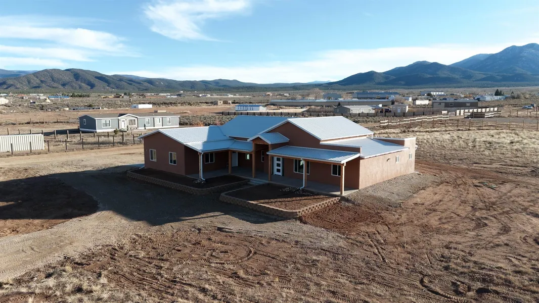 This stunning home is a true masterpiece, offering a perfect blend of spaciousness and coziness. With high ceilings and a modern finish, the home presents elegance and comfort, ready for immediate enjoyment. The thoughtful design ensures no detail has been overlooked, showcasing exceptional craftsmanship throughout. Located near premier amenities such as golfing, biking, and walking trails, the property also provides convenient access to the charming town of Taos and is just a short drive from Santa Fe. The expansive porches are ideal for hosting family gatherings or relaxing with a book while taking in breathtaking views. This property is currently 2 bed 3.5 baths however can very easily be converted to a 3 bedroom home as the Garage has radiant heat and has big windows as well its own full bath. Inside, the home features two generously sized bedrooms and 3.5 bathrooms. The oversized garage offers plenty of natural light through large windows as well as the rest of the home. The Garage offers versatility as a potential studio space.