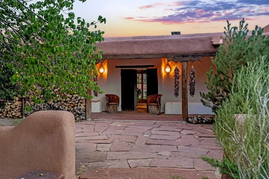 Rich with artistic heritage and timeless New Mexico charm, this extraordinary 4.6-acre adobe compound in Ranchos de Taos blends historic soul, architectural authenticity, and modern comfort. Originally built in the 1830s and once home to renowned Modernist painter Andrew Dasburg, who lived and painted here from 1932 until his death in 1979. The main house features six kiva fireplaces, thick adobe walls, soft plaster finishes, archways, nichos, built-in bancos, and a variety of hand-crafted touches throughout. The property includes a 3-bedroom, 4-bath main home (approx. 3,120 square feet) and a separate 1-bedroom, 1.5-bath guest house (approx. 560 square feet), along with multiple outdoor living spaces, irrigation rights, and panoramic views of Taos Mountain and the surrounding ranges. The entryway welcomes with double doors, dark gray brick floors, and built-in bench seating. The kitchen...