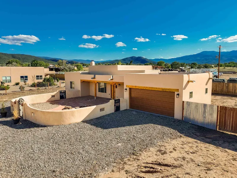 Wow! This home has a LOT of elements that make it an ideal place to live. Want to know more? Set off a dead-end road with a perfect floor plan, views, no deferred maintenance, with the most ideal bedroom and bathroom count this home is rockin! The road and parking area are fully graveled no dirt or mud to worry about. The front courtyard is gated with custom metal gates set in an adobe wall and features a big flagstone patio, a large real rock water feature, and great Taos Mountain views you can also enjoy from the living room and master. Inside, youve got 1,382 sq ft, 3 bedrooms, and 2 full baths. The living room feels open with 12 tongue-and-groove ceilings with large vigas, and a wood-burning kiva fireplace with a nice diamond plaster finish. The kitchen has granite counters, oversized cabinets, stainless steel appliances, and even a wine cooler. In the spaces where window coverings matter most, youll find top-of-the-line Hunter Douglas cellular blinds already in place! The master suite comes with a walk-in closet, dual vanity sinks, and large windows that let in tons of natural light. The house was built in 2021, so theres no deferred maintenance. Its heated by radiant floor heat with an on-demand boiler powered by natural gas for low heating bills. The attached 2-car garage is heated and completely finished. Theres also a whole-house water softener, ADT security system (just needs activation), and a dedicated laundry closet. Out back, youll find a fully fenced yard thats perfect for pets, a portal with a matching flagstone patio, and a brand-new oversized shed for storage. Xeriscaping in the front keeps things easy, and the neighborhood itself is quiet and welcoming. Put your roots down in this neighborhood!