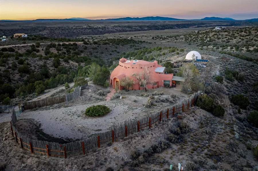 A Dreamy & Wondrous Masterpiece in Taos, New Mexico ~ Perched on five-plus pristine and private high-desert acres at the end of Tune Drive, you will discover "The Dreaming Dome," a dreamy and wondrous architectural masterpiece. Truly whimsical and delightfully outlandish in all the best ways, this structure-as featured on HGTV and in Parade Magazine as "The Most Beautiful House in America"-is more of a sculpture than your standard residence. Inspired by the rainforests of Costa Rica and the New Mexico alpine high-desert, this sustainable, monolithic designed dome includes a yoga hut in the backyard, engulfed by the most stunning views the region has to offer. Upon stepping inside this architectural wonder, you are greeted by a visual dreamland defined by 35-foot ceilings, hand-finished adobe-style walls in rich earth tones, hand-carved doors, travertine tile, luxurious stained-glass chan...