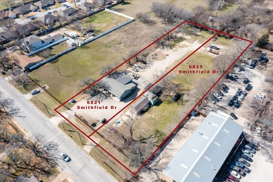 6821 Smithfield Rd (Parcel ID 04031806) is 1 acre and has a 3486 sq ft metal building with 7 bays, office & bathroom. The office is 15x14 & has AC. The front half of the building is 29x60 and the back half 46 x 24. 6825 Smithfield Rd (Parcel ID 04031849) is 1 acre and has a 984 sq ft brick home with 2 rooms & 1 bath, plus 2 large storage sheds. One shed has been finished out inside for office space. Back of the lots is flat land. Property sold as is. Buyer must verify information herein & check with City of North Richland Hills on uses. Property includes multiple parcels. There are 2 additional lots adjacent to 6821 Smithfield that could be purchased with 6821 and 6825. The additional lots (6813 and 6809 Smithfield Rd) are each .889 acre for a total of 1.778 acres (Parcel ID's 41355113 & 41355105).