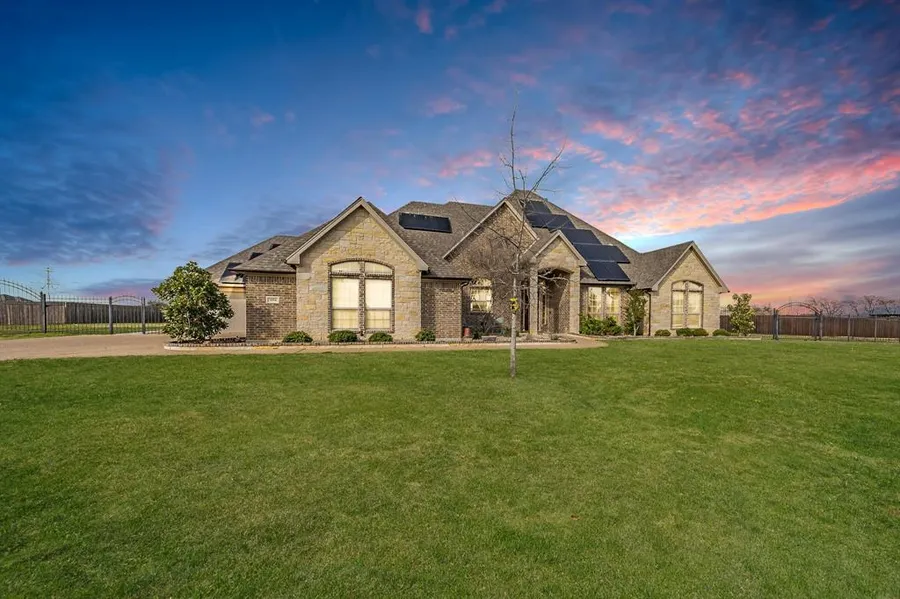 Welcome home to this beautifully designed property nestled on over an acre of land. This magnificent home offers a perfect blend of modern elegance & comfortable living, providing a serene & luxurious retreat. Home boasts a bright & open floor plan with 4 bedrooms, 3 full baths, dining area, built in office area, & a 3 car garage. Enjoy entertaining in the gourmet kitchen with 2 islands, a dbl oven, gas range, tons of cabinet & counter space! Living room features a beautiful stone fireplace with floor to ceiling windows overlooking your beautiful acre of land. Guests will love the spacious ensuite with the private bath that also has access to the back patio. Primary bedroom is great size with a garden tub, tiled shower, huge walk in, & sep vanities. Relish those warm summer days relaxing in your backyard oasis beside the beautiful pool & spa or working in the greenhouse gardening. Sellers will pay off the solar panel balance & have not had an electric usage bill since installed.