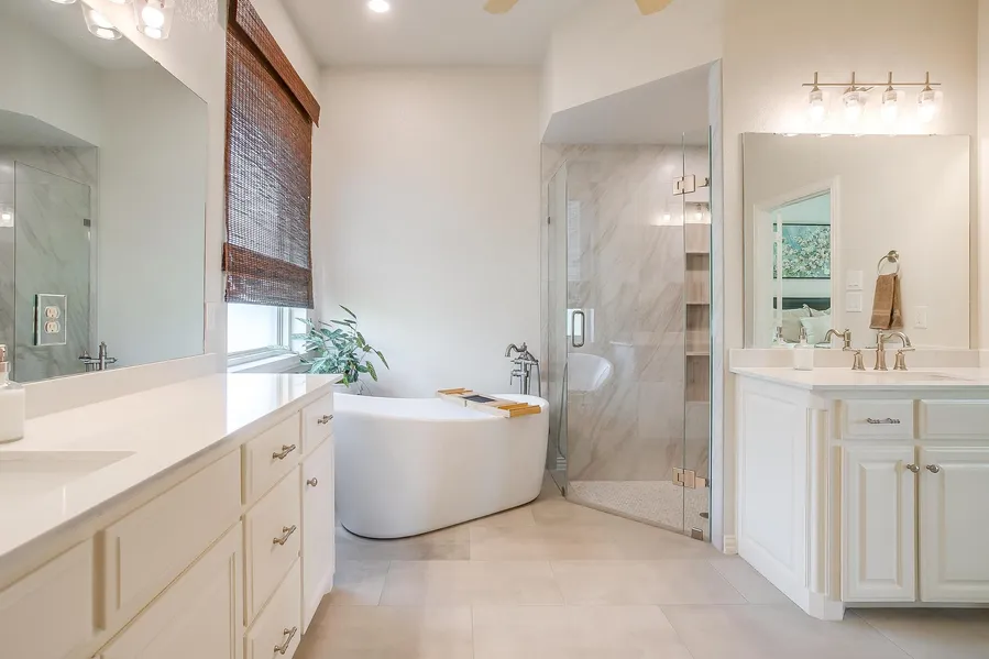 residence features a stunningly remodeled primary bath with high-end finishes, offering a