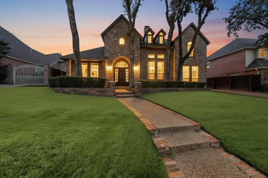 This French inspired residence showcases exquisite, detailed molding throughout, a graceful double arched entryway, soaring ceilings in both the foyer & formal living room. You will be impressed with the marble flooring, beautiful chandelier & curved stairway as you step into the foyer. Expansive windows & transoms flood the space with natural light, creating a bright and airy ambiance. The double-sided fireplace creates inviting spaces for relaxation & entertainment in both the family room and formal living area. The built-in cabinetry & bookshelves provide additional storage & workspace. Wood plank laminate flooring was recently installed in the living room, dining room & library, along with fresh interior paint throughout the home. The primary suite features a tray ceiling for added height, & upstairs, two bedrooms feature vaulted ceilings while the third offers a cathedral ceiling. The upstairs family room is vaulted with a coffered skylight, & the jack-and-jill bath provides separate vanities for two bedrooms. The third upstairs bedroom is a private ensuite with a full bath and walk-in closet. Outdoor entertaining is effortless on the spacious Trex patio deck overlooking the backyard. Set within an exclusive 21-home gated community, this home combines privacy with convenient access to DFW Airport, the Arlington entertainment district and major highways, (I-30, 183, 360, 157, 161).