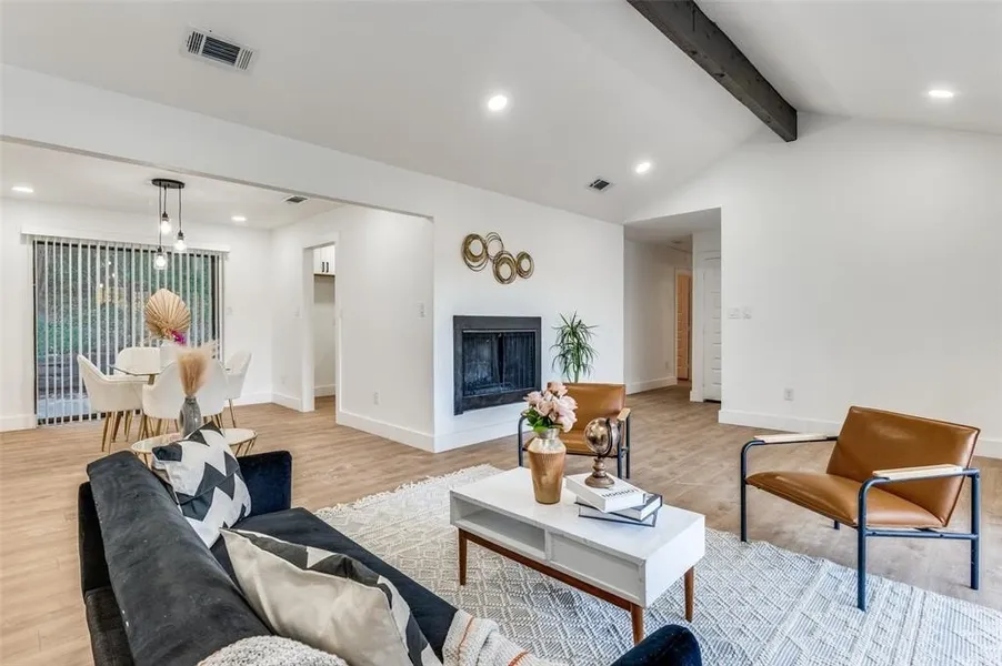 Tucked away on a quiet cul-de-sac, this beautifully updated 4-bedroom, 3-bath split-level home offers the perfect mix of privacy and style. Perched on an elevated lot surrounded by mature trees, the home welcomes you with modern finishes, vaulted ceilings, and an open-concept layout full of natural light. The spacious living room features exposed beams, a striking fireplace, and a seamless flow into the dining area—perfect for entertaining. The galley kitchen is equipped with white shaker cabinets, quartz counters, and stainless-steel appliances. Retreat to the oversized primary suite with a stunning walk-in shower and double vanities. Secondary bedrooms are generously sized with great closet space and updated bathrooms nearby. Enjoy peaceful views from your private wraparound deck or host friends in the large backyard. The 2-car garage is tucked underneath, and the long private driveway gives the home a treehouse feel. Located near major highways and just minutes from shopping, dining, and downtown Fort Worth.