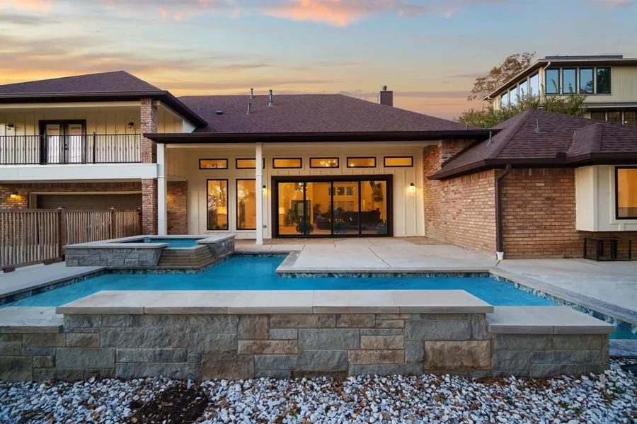 Set within one of the area’s most scenic hill country style neighborhoods, the property captures nature in every direction. The backyard is a true showpiece, elevated above the terrain with a remarkable lake view, mature trees, and a modern pool that reflects both sunrise and sunset. From morning light shimmering across the water to golden hour skies stretching over the treetops, the setting feels genuinely magazine worthy.