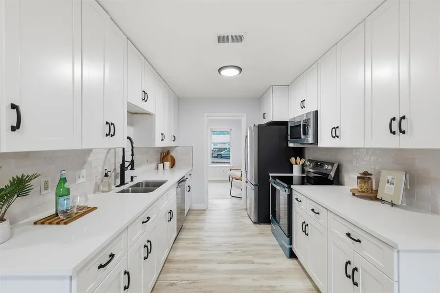 The kitchen is a true standout with crisp white cabinetry, quartz countertops, subway tile backsplash, matte black hardware and fixtures, and all new stainless steel appliances. A galley layout maximizes storage and prep space while keeping everything functional and streamlined.