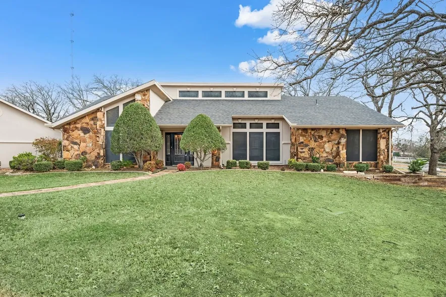 Set on just under 5 acres in Mansfield, this rare single-story property offers privacy, space & classic Texas ranch appeal which is all priced under $1 million. With over 3,000 square feet, this 3-bedroom, 2.5-bath home showcases mid-century architecture with rustic character, highlighted by stone accents on both the interior and exterior. The home is move-in ready and well maintained, while offering an excellent opportunity for cosmetic updates to suit your personal style. Natural light fills the home through large windows, complemented by tall ceilings, wood floors, crown molding, plantation shutters & solar screens. The spacious kitchen features granite countertops, white cabinetry, ample workspace & updated appliances, making it functional today with room for future enhancements. The living area is warm & inviting with a stone fireplace, generous proportions & a wet bar which is idea...