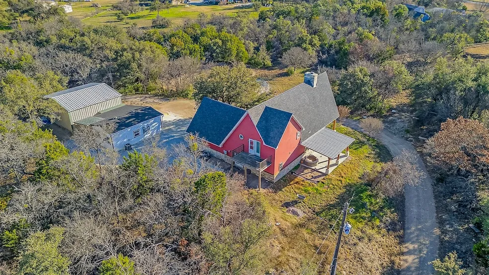 Perched atop a wooded hillside, this refined Texas country estate offers privacy, space, and timeless character. The property features a newly built detached 1-bedroom, 1-bath guest suite with a full kitchen and living area, approx. 800 sq ft, ideal for multigenerational living, guests, or income potential. The main residence spans over 2,200 sq ft, showcasing soaring vaulted ceilings, abundant natural light, and a dramatic 30 foot Austin stone fireplace anchoring the living space. A well appointed kitchen includes dual walk-in pantries for exceptional storage. The primary suite opens to a private balcony overlooking the treetops and is complemented by a recently updated ensuite bath. Flexible living continues with two spacious lofts and an additional upstairs room with two closets. Three new HVAC systems ensure comfort and efficiency. Set on 2.25 private acres with mature pecan trees, native landscaping, and visiting wildlife, the outdoor spaces are designed for both relaxation and entertaining, featuring covered patios and a newer pergola. A 16 20 powered workshop with carport and a 2023-built 30 30 concrete floor barn provide exceptional space for RVs, equipment, or recreational vehicles. Conveniently located with quick access to Downtown Fort Worth and Weatherford, and major shopping just minutes away.