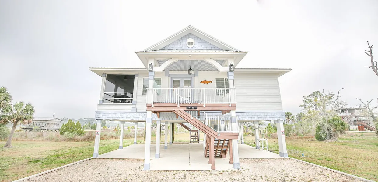 Inside, you'll find beautiful LVP flooring, custom tile showers, solid surface countertops, and bespoke lighting throughout. The home's unique character shines from every corner. The exterior is equally impressive, featuring covered parking for you and your guests, ample storage for fishing gear in a spacious downstairs shed, and an outdoor shower to refresh after a day on the Gulf.