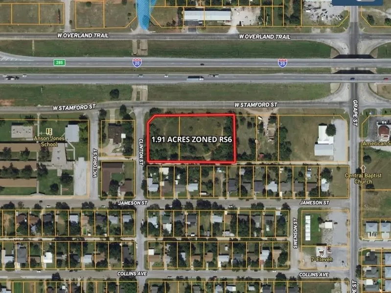 1.91 ac on access road for eastbound I-20 traffic. While this parcel is zoned RS6, zoning changes to accommodate commercial development one block west sets precedent for a rezone of this parcel from residential to commercial. Recent nearby development brings more exposure, visibility and traffic to this potential commercial parcel. Situated at the corner of Clinton and Stamford with Grape as the next arterial at the east end of the block. Listing is for 1900 Stamford (Taylor CAD ID 45208, .7231 ac) and 1825 Stamford (Taylor CAD ID 45326, 1.2101 ac).