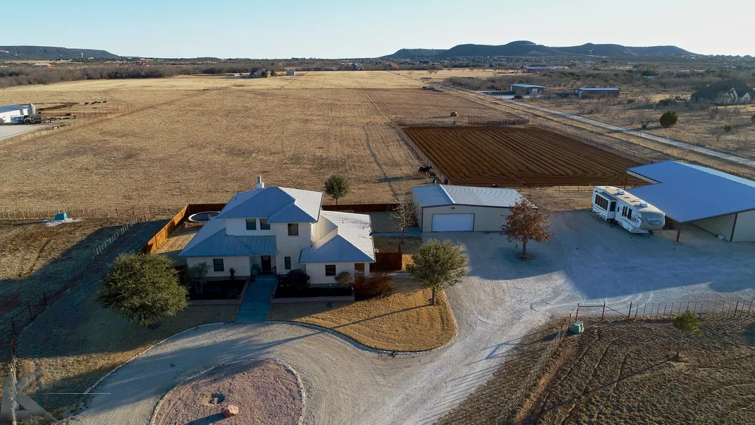 Spectacular Horse lover's Dream situated amongst 12.5 Acres of breathtaking panoramic views in the heart of Taylor County. Impressive custom-built home featuring casual elegance design. Spacious living highlights the gorgeous stone fireplace. Beautiful arched opening invites you to a designer chef's kitchen including stylish cabinetry, granite counters, dual ovens, walk-in pantry and an eat-in dining. Oversized utility room with separate office space. Elegant primary ensuite features a tiled bath, complete with ample closet space and saferoom. Powder room for guest downstairs. Separate garage with workshop attached. Absolutely immaculate 45*75 Horse barn includes 3 stalls, tack room and a wash bay. The 20*45 awning opens to an incredible arena with the perfect team roping setup! Entirely fenced. Located in the highly desirable Wylie West ISD!
