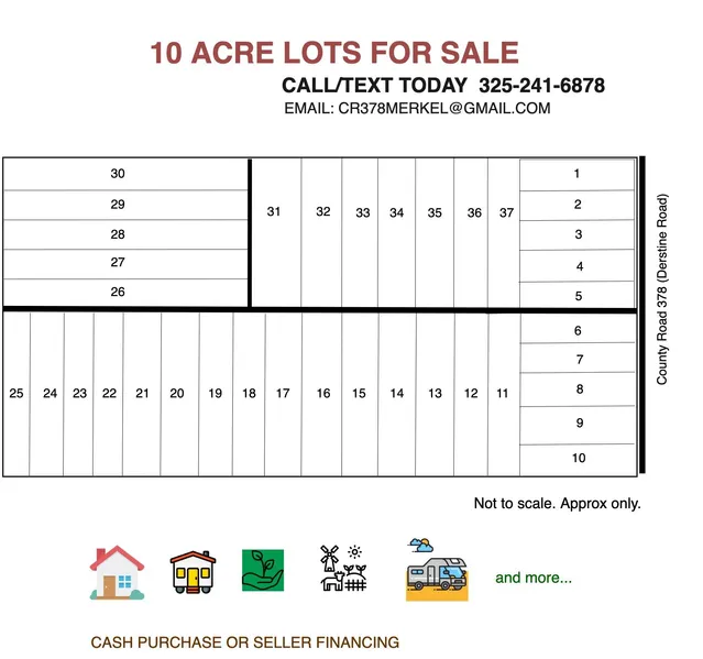 Research Parcel InformationFrom Abilene, drive along I-20 West towards Merkel. Take exit to Derstine Road (County Road 378) and drive North just over a mile. Property will be on the left. Subdivision layout banners are visible along the county road.