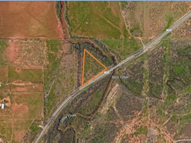 Triangular 2.5 ac creekbank property along Cedar Creek outside the city limits, but 2.5 miles from I-20 via West Lake Rd. City effluent water line roughly 370 feet from top boundary - this is not potable water. East boundary on Neas 0.82 mi from East Lake Rd, west boundary on Neas 1.22 mi from West Lake Rd. Stafford Elementary, Mann Middle, Abilene High Schools. Property is wholly in the 100-year flood plain.
