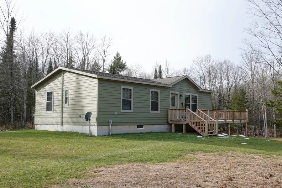 2 bedroom, 2 bath ranch style home on +/- 12.32 acres bordering the Chequamegon National Forest. Full poured basement, with walk out and spray foam insulation is ready to finish. This newer home included appliances, fireplace, a 2 plus car garage and wrap around deck.