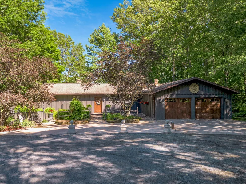 Built in 1983 and recently updated, this spacious 3,200 sq. ft. home harmonizes rustic charm with modern comforts. The new kitchen, featuring stylish cabinets and a coffee bar, is a culinary haven, while large windows throughout bathe the interior in natural light and offer stunning views of the surrounding wooded setting. The inviting living room, complete with a cozy gas fireplace and patio doors leading to a deck overlooking the river, is perfect for relaxing or entertaining.