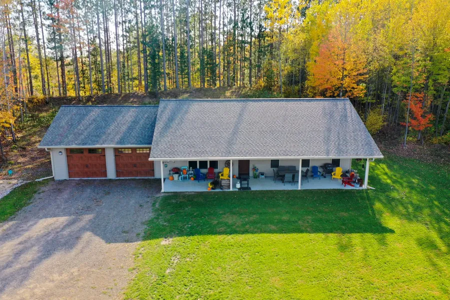Private 2 bedroom, 2 bath country ranch home on +/-30 wooded acres with a wildlife pond. Open concept design with cathedral ceilings. Kitchen with Cambria countertops, subway tile backsplash, island with breakfast bar and walk-in pantry. Master suite with walk-in closet and private master bath with an oversized tub. In-floor heat in the house and attached 2 car garage. Large covered porch with water and yard views. +/-30acres of land with abundant wildlife and excellent hunting opportunities. Refrigerator, stove, microwave, dishwasher, washer, dryer, water softener, window coverings, garage refrigerator and yard shed are included in the sale price.