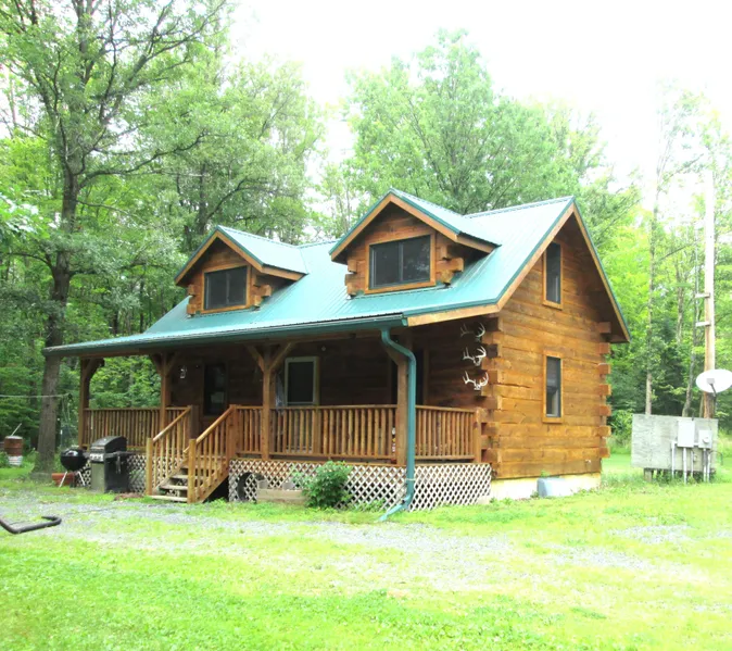 Log Cabin built in 2016. One and a half story with 2 bedrooms upstairs, full poured concrete basement. Constructed of 6 inch x 10 inch tongue and groove logs. Overall dimension is 16 feet by 30 feet with a full length covered porch .