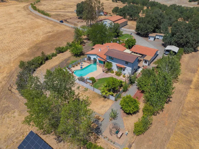 Ranch Living on 25+ Sprawling Acres. From the custom front door through the soaring vaulted great room, this thoughtfully designed 25.80 acre country estate showcases exceptional quality and timeless craftsmanship. The great room features substantial wood beams, warm wood ceilings, and tile floors with radiant heat, while an efficient wood stove adds both function and rustic charm-all elements that define this home's character. Flow upward into the spacious dining area and into the updated chef-ready kitchen, outfitted with custom cabinetry, quartz countertops, and quality stainless steel appliances-ideal for both everyday meals and grand entertaining. A versatile bonus room offers flexible space for hobbies, media, or a workout studio. The primary suite and private office and 2 bathrooms are conveniently located on the main level, while two additional bedrooms and a full bath upstairs serve family or overnight guests. The grounds are equally impressive-manicured yards bursting with mature plantings, seasonal garden beds, and perennial blooms set the stage for outdoor living. Step outside to a sparkling gunite pool featuring a cool deck and pergola-covered patio + outdoor kitchen. A standout design feature allows the pool's edge to flow seamlessly into the great room, creating indoor-outdoor harmony. Fully equipped for hobbyists and ranchers alike: a 3-car garage, additional storage building, plus a massive 60 * 60 shop/barn with concrete flooring, two box stalls with turn out, dual roll-up doors, two man doors, and five covered bays-ready for workspace, animals, equipment, and storage. A well-maintained 3bed, 2bath 1,170 sqft manufactured home provides a private, self-contained dwelling, supporting multi-generational living, caregiver housing, or rental income without impacting the main home's comfort and privacy. Leased Solar and fully fenced & cross-fenced acreage round out the features.