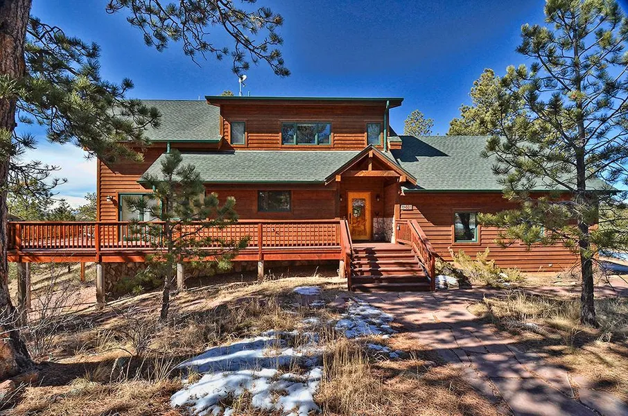 Tuck yourself away in your Colorado Mountain retreat on this 70 acres at the end of the road. Snow-capped horizon to horizon mountain views are the vista with your own towering ponderosa pine scented forest surrounding you. This 3 bedroom, 3 bath mountain home offers a gourmet kitchen with double ovens, huge pantry and built in breakfast seating. Stepping into the Great Room windows bring the outside in while the fireplace offers ambiance and charm. A bedroom and bath complete the main level. Upstairs you will find a bedroom with attached bath and a loft ideal for an office. Downstairs the walk-out basement includes a family room, bedroom and bath. THe oversized two car garage offers room for toys and fun.Ask about the possibility of purchasing the house turn key and success of a vacation rental if desired.