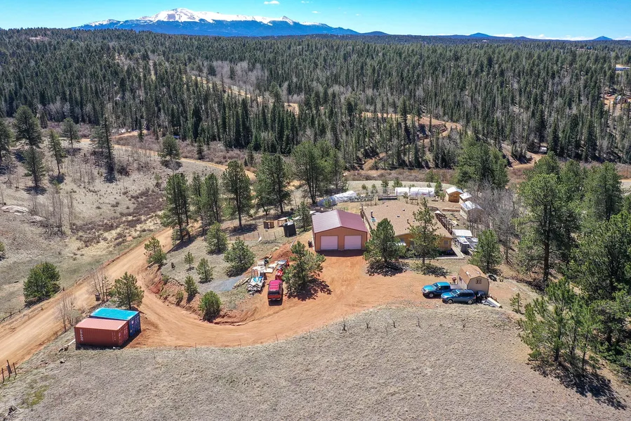 Escape to the serene Colorado mountainside with this updated Florissant home on over four acres. Enjoy a gourmet kitchen, open floor plan, four bedrooms, and easy-care luxury vinyl flooring. Step outside to a 900 sq ft composite deck with Pikes Peak views, plus a newly completed 30x30 metal building. Embrace a country lifestyle with greenhouses, raised beds, animal pens, and fenced areas for gardening and furry friends.