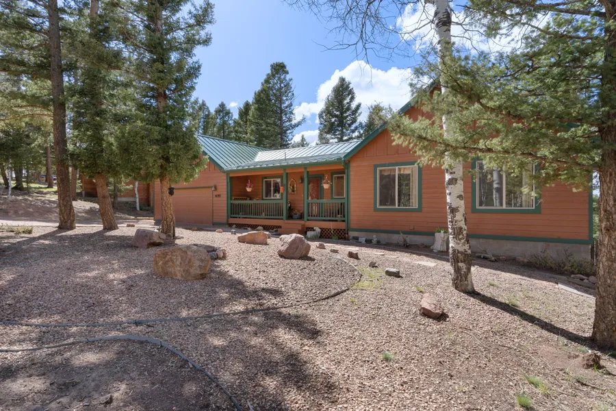 Welcome to serene mountain living! Nestled within a wooded community, this charming four-bedroom, three-bathroom ranch-style home offers the perfect blend of natural beauty and modern amenities. Walking through the front door you’re greeted with a welcoming living area featuring a stunning stone fireplace allowing for a cozy yet luxurious feel. The family room flows into the dining area, which is a true extension of the home’s rustic elegance, creating an inviting atmosphere perfect for both everyday living and entertaining. The kitchen is an extension of the living area which creates an inviting, and functional space. The stainless appliances are not only practical but also elevate the aesthetic of the kitchen. The main level primary suite offers true indoor-outdoor living with access to a balcony perfect for quiet mornings offering a sense of connection with the land and the natural beauty of the trees. Each bedroom is designed for comfort and tranquility offering wooded views from every window highlighting frequent visits from deer, fox, and other forest animals. There's also a fully finished walk out basement. Your fenced backyard is a nature-filled retreat. A newer metal roof and water heater are excellent improvements to the home, allowing for maximum efficiency. This home boasts an oversized heated two-car garage with built-in workbench and storage shelves, allowing for ample space for projects, and storage. In addition an oversized garage, there is an extra wide driveway for RV parking which enhances the functionality and versatility of the one acre homesite. Whether you are relaxing on the expansive rear deck, exploring the wooded surroundings such as Pike National Forest Recreation Area, or enjoying the area lakes, this property promises a unique living experience. With private lakes nearby for fishing, kayaking, or enjoying events at the community pavilion. Located less than 4 miles to area conveniences. you get the best of both worlds. Welcome Home!