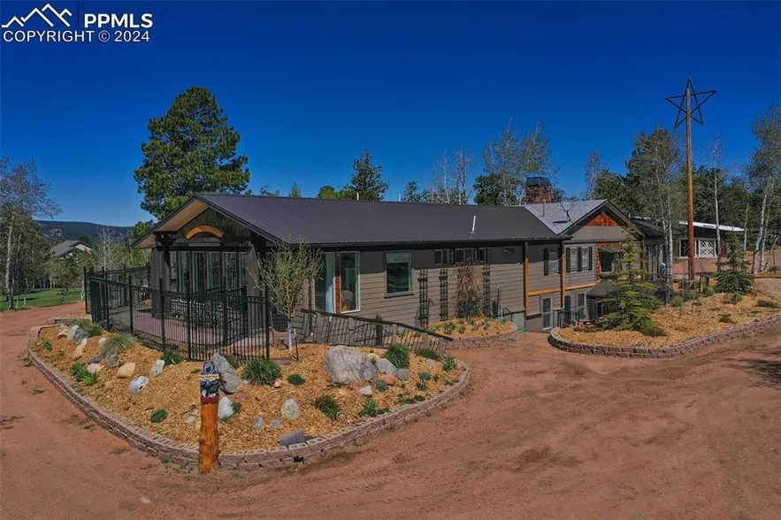 Welcome to your dream home nestled on a sprawling almost 17-acre estate right in the heart of town! This irresistible property, built in 2023 and meticulously remodeled to perfection, offers unparalleled luxury and comfort. As you step inside this ranch-style haven, you're greeted by an expanse of 5,684 square feet of meticulously crafted living space, boasting high-end finishes that seamlessly blend with the natural beauty of the area. From the moment you enter, the attention to detail is evident. Home completely remodeled 2019.The main level features an open floor plan with soaring ceilings, adorned with custom woodwork and skylights that flood the space with natural light. The gourmet kitchen is equipped with top-of-the-line appliances, stone countertops, and a spacious island. Adjacent is the inviting living room, complete with a grand fireplace and panoramic windows framing breathtaking views of Pikes Peak. The luxurious master suite boasts a spa-like en-suite bathroom with a jetted tub, double vanity, and a free-standing shower, as well as its own fireplace and private sitting area. The lower level is an entertainer's paradise, featuring a sprawling family room with built-in bookcases, a cozy fireplace, and a wet bar. Step outside onto the covered concrete deck and soak in the beauty of the surrounding landscape, where Pikes Peak Views create a picturesque backdrop for outdoor gatherings. This property is not just a home; it's a lifestyle. A 960 square foot barn, perfect for housing your equine companions, add to the allure of this remarkable property. Conveniently located near hiking trails, parks, and shopping centers, this home offers the perfect balance of privacy and convenience. With its unrivaled beauty, high-end finishes, and prime location, this is truly a once-in-a-lifetime opportunity to experience the best that Colorado living has to offer. Don't miss your chance to make this exquisite property your own and indulge in the ultimate luxury lifestyle!