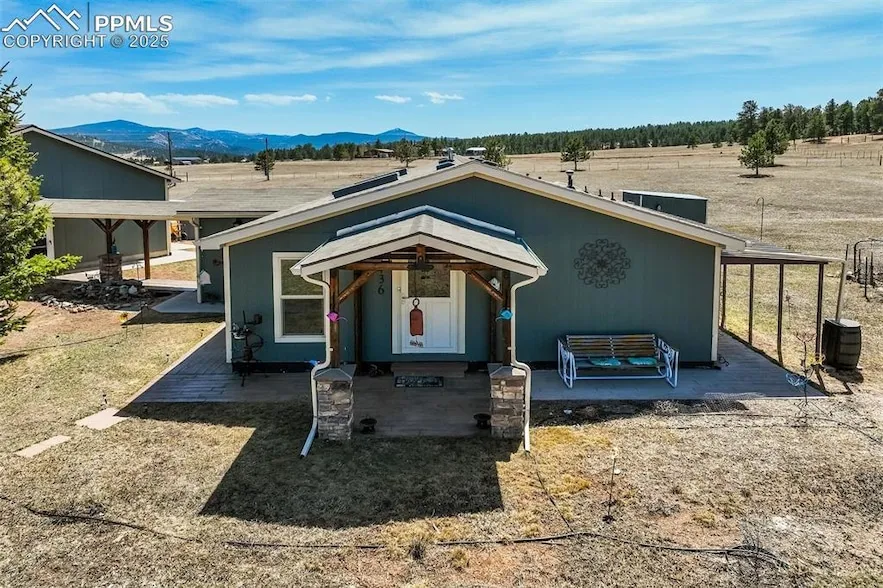 Discover the perfect blend of rural tranquility and modern convenience on this meadowed property, showcasing breathtaking views of Pikes Peak. Ideal for horse lovers, the land is fully fenced around the perimeter perfect for livestock or dogs and teeming with Colorado wildlife, including elk and deer. The home has been completely remodeled inside and out, featuring new siding, Pella windows, skylights, updated flooring, cabinetry, fixtures, doors, and more. A full foundation and purged title provide peace of mind, while custom touches throughout elevate the living experience. Step through a stunning covered breezeway complete with stone pillars and exposed wood beams into a home that combines rustic charm with modern upgrades. Enjoy stamped concrete walkways, a rear patio with a stone firepit, and a heated entry with tiled floors and wood-paneled accents. Inside, the kitchen opens to a spacious living area with a breakfast bar, dining nook, and barn door detailing. The primary suite features a walk-in closet, granite double-sink vanity, and a custom tile walk-in shower. Additional highlights include a large crawl space for extra storage under the home and a truly exceptional garage/shop. The 28x48 heated and insulated drive-through garage is a craftsman s dream come true fully powered and ready to handle any project or hobby you can imagine. Featuring a 220V outlet as well! It even includes an attached greenhouse for year-round growing. **Please check out the 3D walkthrough to see the garage and greenhouse!** Located just 5 minutes from a major state highway, this peaceful retreat keeps you connected: 20 minutes to schools, hospitals, and top retailers, 60 minutes to Colorado Springs, and 90 minutes to world-class ski resorts. National Monuments and State Parks are just a short drive away, offering endless outdoor adventure. Come experience the lifestyle you ve been dreaming of peaceful, scenic, and move-in ready.