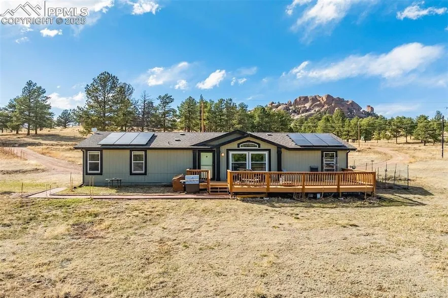 Tucked into the wild and wonderful Ranch Resorts community, this 3-bedroom, 2-bath ranch-style home on 2.29 acres is more than a home it s a mindset. Built in 1996, with updates since, this cozy 1,428 sq ft home packs a punch featuring an owned solar energy system installed in 2014 (no lease, no payments, just long-term energy independence), a powerful forced-air furnace (2019), upgraded plumbing, and an ultra-efficient ComfortBilt pellet stove with an 80lb hopper, which could probably heat a cabin in Alaska. Reverse osmosis water filtration system? Check! Washer and dryer included? Of course! And here's the kicker low maintenance, low bills, and zero HOA nonsense. Let s talk vibe: Funky artist flair meets quiet country life. Beautiful dark wood-look luxury vinyl throughout to add luxury and cohesion. Neutral walls are accented with color along the trim and upper reaches, complemented by an optional original oil painting (see extras) that brings charm and warmth. The layout is practical, cozy, and spacious. Oversized deck with views and great space for entertaining!Ranch Resorts offers year-round road maintenance and the kind of elbow room neighbors in the city can t even imagine. The circle drive means parking many vehicles is a breeze. No garage, but plenty of space to add one, or park all the gear, trailers, toys, and tools your Colorado lifestyle demands. Shed on site lets you store maintenance materials with ease. Well water, natural gas, septic, and plenty of stars at night. Welcome to freedom!Clean, solid, and well cared for this home is perfect for those who value independence, simplicity, and living with intention. Ready to explore the lifestyle this home offers? Schedule your private tour today.