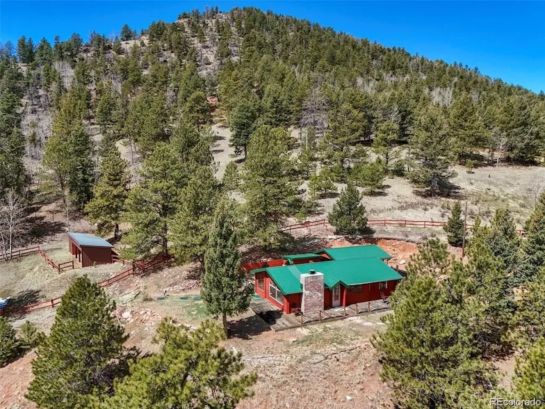 Welcome to the Gingerbread Ranch an impeccably upgraded cabin on 5 acres of horse-ready land, complete with a stable and corral. Once a seasonal hideaway, this home has undergone a complete transformation and now offers modern comforts in a serene mountain setting. Start your day on the expansive 500 sq ft deck, where you ll take in breathtaking views of Pikes Peak and Sheep Mountain. Wildlife often wanders by, making every morning feel like a nature show from your own backyard. Inside, you ll love the warm, vintage charm paired with high-end upgrades. The wood burning stove in the main living area paired with the wall of windows overlooking the view creates an incredible and immersive mountain experience. The brand-new kitchen features soft-close cabinets, high end appliances, granite countertops, and heated floors. The fully renovated bathroom includes a sleek new vanity, walk-in showe...