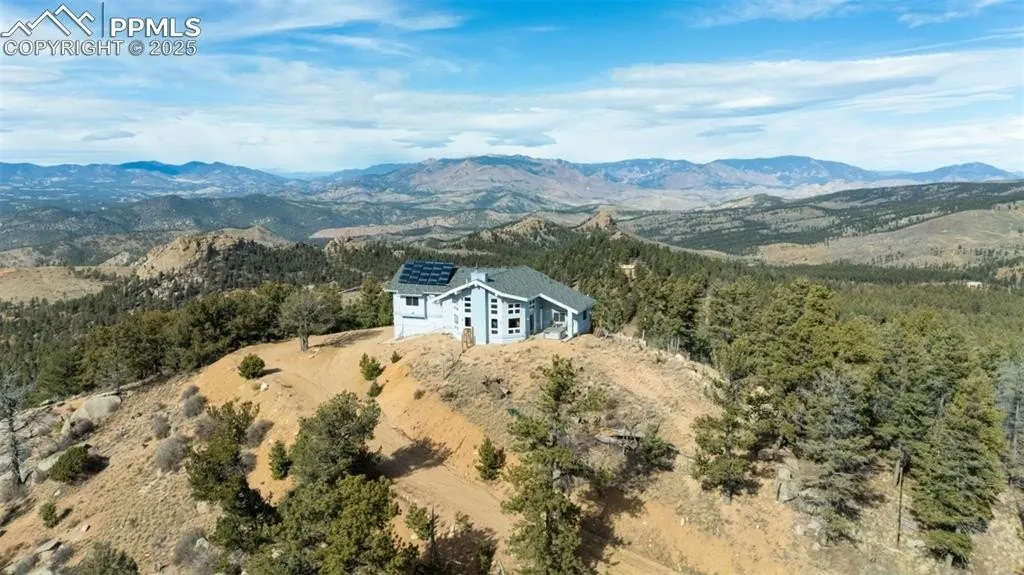 Colorado Living at its best, enjoy the high life at 9400 ft+ elevation, one of the highest points in the area! 360 degrees of spectacular views to include Crystal Peak and Pikes Peak! 14.71 Acres to enjoy the outdoors and 90 minutes from some premier ski resorts. Wood burning fireplace in the Great Room with tremendous natural light from the south facing wall of windows with endless views. The upper master bedroom has a 5-piece en-suite bath, walk in closet, and vaulted ceiling. The other 2 bedrooms are on the main level, with a full and half bath on the main level as well. Upstairs is a large Family room and a space that could be used as an office that overlooks the Great room and has built in bookshelves. Walk out from the main level to the Hot Tub with tremendous views! There is an electric gate at the driveway entry, kind of your own fortress at the top of the mountain. 2 car garage with 8' garage doors. Passive Solar radiant heating and an owned propane tank as well. RV parking with septic hookups. Zoned for Horses. New Roof 3/12/2025, class IV hail impact resistant shingle, save on insurance. Million-dollar views for much less, Come see this beautiful home today!