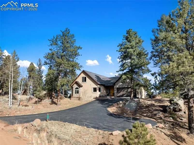 Exceptional Colorado mountain home on 2.10 acres featuring breathtaking mountain views, dramatic natural rock formations, and sweeping valley vistas. This pristine, custom-built residence showcases quality craftsmanship throughout, including tongue-and-groove ceilings, knotty pine doors, vinyl interior windows, Marvin windows, and rich hickory hardwood floors. The custom kitchen is highlighted by raw-edge granite countertops and a built-in wine cooler-perfect for entertaining and mountain living. Designed for comfort, safety, and efficiency, the home includes radon mitigation, fire mitigation, a full-house generator, whole-house water softener, and an impact-resistant heated metal roof. Enjoy cozy evenings by the gas fireplace with thermal blower and fan, while cellular shades provide energy efficiency and privacy throughout. Outdoor living shines on the expansive deck overlooking Pikes Peak and the valley below, offering incredible Colorado sunsets and abundant wildlife. The oversized garage is plumbed for radiant in-floor heat, adding flexibility and comfort. The primary bathroom features a jetted soaking tub, creating a private spa-like retreat. A rare opportunity to own a meticulously maintained mountain retreat combining privacy, views, acreage, and modern mountain comforts.