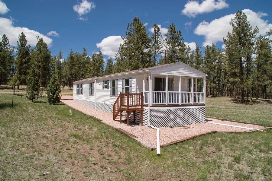 Drive onto this 20 acre parcel through tall mature pines to wonderful privacy where you will find a very nicely kept 60' X 16' purged single wide Mobile Home in meadow. Century wood stove on tiled hearth. Nice open living room/kitchen and dining area concept. Newer washer and dryer in hallway with storage. Large master bedroom has large adjoining bath which has double sinks, soaking tub with shower and separate toilet room. Covered deck off living room to enjoy the peace and tranquility of the Colorado mountains.