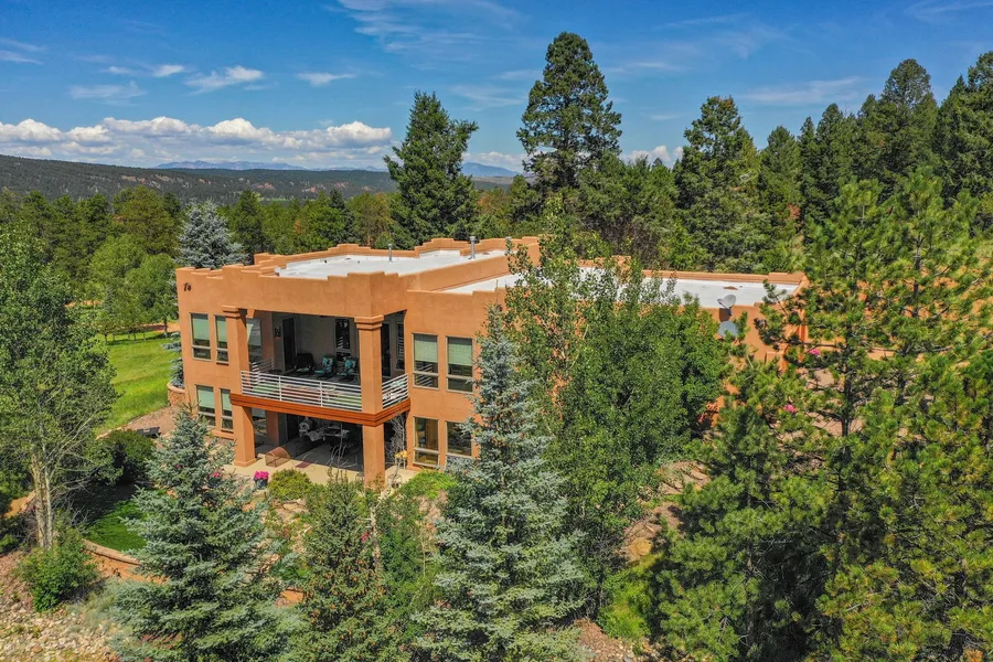Its custom-designed Santa Fe-Style luxury home has been immaculately maintained and offers unique features like custom iron work, curved walls and fine finishes. A comfortable and open format on the main level includes a gourmet kitchen, breakfast bar (seats 6), dining area and a great room with fireplace. As you walk out onto a beautiful and newly updated covered deck, relax into the crisp Colorado air, deep blue skies and soak in the front-seat views of majestic Pikes Peak. Double doors grant entry into a master suite complete w/gas fireplace, sitting/exercise room, elegant bath w/heated floors, walk-in closet and deck access. Added to the main level is an extra flex room/office with bookshelves/cabinetry, large windows and a generously sized mud room.