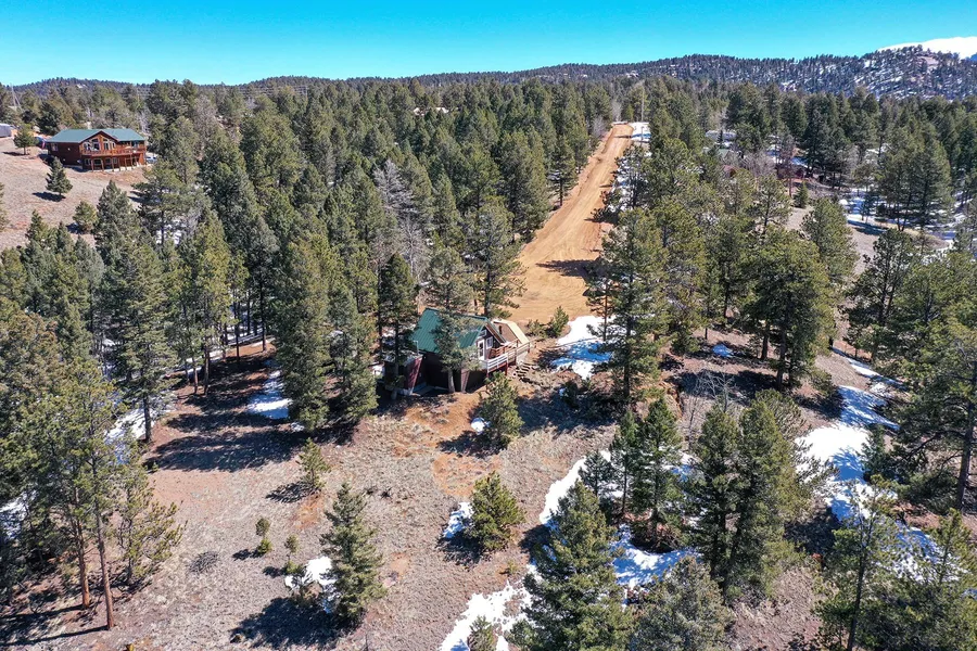 Located in the Colorado Mountain Estates Subdivision, this charming A-frame retreat offers a tranquil escape right in the heart of Florissant, Colorado. This cozy studio home boasts a perfect blend of both rustic charm and modern comforts. As you step through the welcoming entrance, you're greeted by the centerpiece of the main area - a magnificent earthstone, radiating warmth and serving both as a fireplace and a focal point for gatherings and relaxation. You will find a cozy kitchen as well as a small bathroom and built in storage space throughout. A ladder to the small loft up top offers a comfy retreat beneath the vaulted ceili...