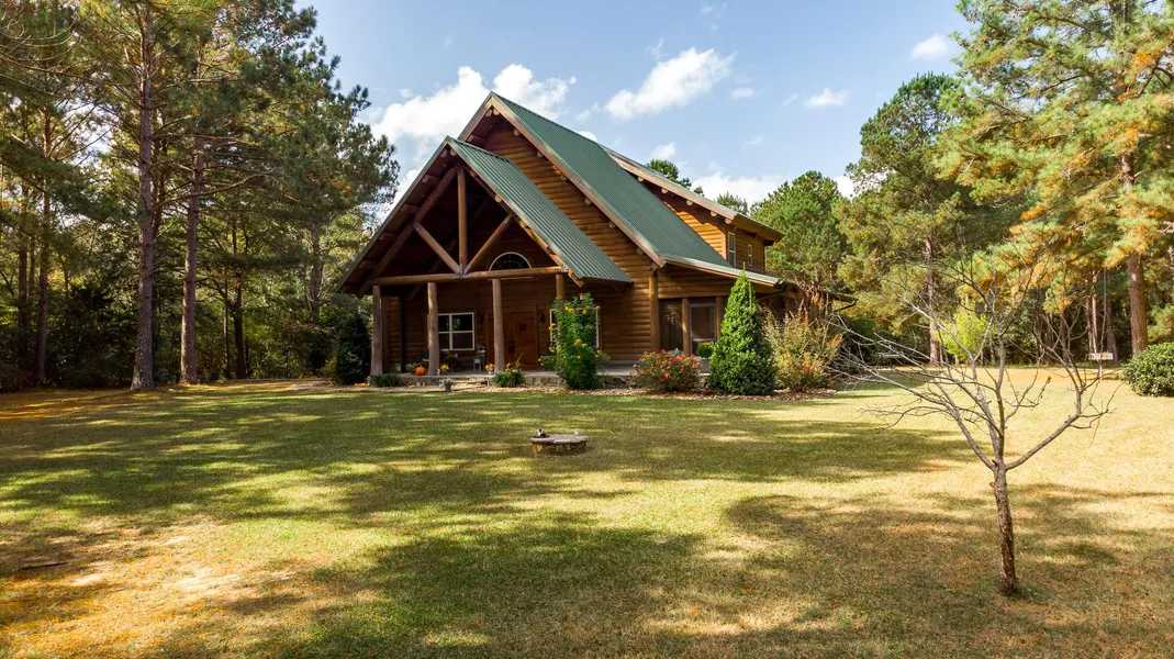 Cypress Lodge is a custom-built log home located on the outskirts of Dawson, Ga on 60 acres of manicured pine forest. The 2,600 square feet consist of 3 bedrooms, 2 full bathrooms, and a large great room. A stone fireplace, a standing seam metal roof, and an open concept with very high ceilings are just a few of the many features. Red cypress logs in which the house was constructed weigh more than 9,900 pounds each. The interior walls and ceilings are also made from the same red cypress wood. True to authentic log construction, the home is very energy efficient and virtually indestructible. Custom-built furniture was made exclusively for this unique home making it move-in ready for a new owner.