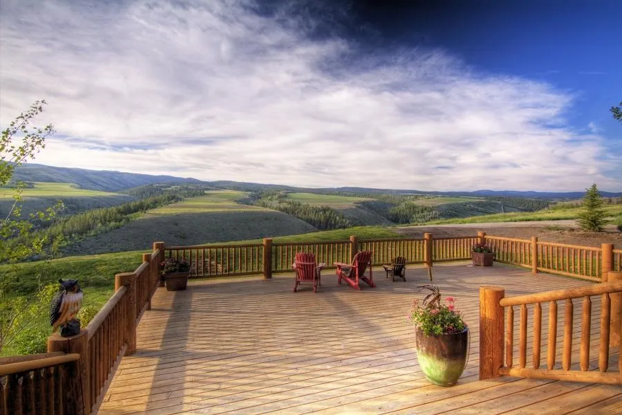 Set high on one of the propertys four plateaus is the main lodge. Built as a family retreat, it takes in the vast vistas of forested canyons, rolling meadows and big skies. The lodges main room with its log beams and stone fireplaces has a decidedly inviting, western feel. The main room provides the perfect gathering place to share stories after a shoot or to relax and have a cocktail before dinner. There are 9 comfortable guest bedrooms. The professional kitchen, exquisitely laid out with new appliances and spacious granite countertops, has been used by celebrity chefs to prepare meals. The spacious decks with expansive views of mountains, canyons and fields provide a perfect place for meals and outdoor events.
