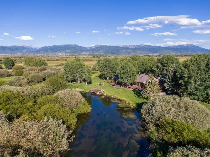The land is complemented by a custom-built 2,575+/- square foot two-bedroom, two-bath single level log home just steps away from the Teton River. A spacious and open floor plan with gourmet kitchen and bar, a large wrap around deck, firepit and dock on the river add to the main homes charm. From the main residence, an elevated boardwalk spanning a lush spring corridor takes you to the two-story 5,046+/- square foot guest lodge complete with two-bedrooms and two-baths, pet washroom, a large family entertainment room with a wood burning fireplace and full kitchen, and a multi-purpose space used as an office, art studio and tack room. Both homes were completely renovated from the foundation up in 2018 by one of the valleys most reputable, high-end home builders.