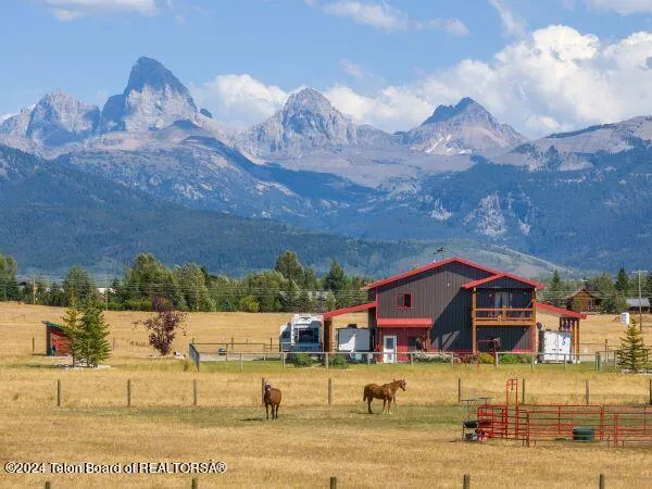 Welcome to your dream horse property with a VIEW!! Nestled on 5.62 acres with unparalleled and unobstructed views of the Teton Range. Built in 2021, this unique 2 Bedroom 2 Full Bath property is perfect for those who crave tranquility, privacy, and endless amounts of heated and/or covered storage areas for trailers, vehicles, and all things recreational!! The garage area is 1474 sf of finished space with a Rinnai Propane heater...ideal for a workshop, storing vehicles, gear, tools, boats, or to simply add more living space. RV hookups. 220 amp service in garage. Property has a perimeter fence and a large pet-friendly fence around the home. Above the garage you'll find the heart of the home with close to 1500 square feet of living space designed to maximize comfort and the breathtaking surroundings. The open-concept floor plan seamlessly blends rustic charm with contemporary finishes, cre...