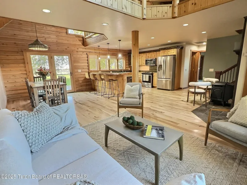 VIEW CORRIDOR CHARMING LOG HOME! Authentic Teton Valley Living with Unmatched Views. Discover the essence of Driggs living in this stunning log home, perfectly positioned to capture panoramic, three-peak Teton views-one of the most sought-after features in our area. Set on 2.11 beautifully landscaped acres, this 3-bedroom, 2.5-bath residence offers the ideal balance of mountain charm, privacy, and modern convenience. The home is thoughtfully designed for flexibility, with reasonable neighborhood covenants that allow for short-term rentals-an excellent option for income potential or seasonal use. Mature trees and lush landscaping enhance the serene setting, while a fenced backyard and separate fenced pasture provide room for pets or hobbies. Outdoor living shines with oversized decks on both the front and back of the home, inviting you to relax and enjoy sunshine or shade throughout the day. The natural insulation of the log construction ensures comfort in every season, while the peaceful surroundings make this an ideal mountain retreat. Step inside to a welcoming great room with soaring ceilings and an open loft that fills the space with light. You will appreciate the great room which features Teton views from the sofa. The chef in any family will appreciate the abundance of cabinets and thoughtful layout of the kitchen. A beautiful stainless steel appliance package includes a dual fuel range. There is also a nice pantry located just off the kitchen. While the primary heat is from a forced air furnace, there is a charming pellet stove that provides nice ambiance and a fun place to warm up quickly after a day on the slopes. The main-level primary suite offers privacy and comfort, featuring a large walk-in closet and direct access to the front deck. Upstairs, the spacious loft provides flexible use ideal for a home office, media room, workout space, or more. Two guest bedrooms, each with walk-in closets and extra storage, share a well-appointed full bath. Only 15 minutes from world-class skiing at Grand Targhee and minutes to the Teton River for fly fishing, this property places you at the heart of everything outdoor enthusiasts crave. Whether you're looking for a full-time residence, vacation home, or investment property, this log home delivers it all. Schedule your private showing today and experience the best of Teton Valley living.