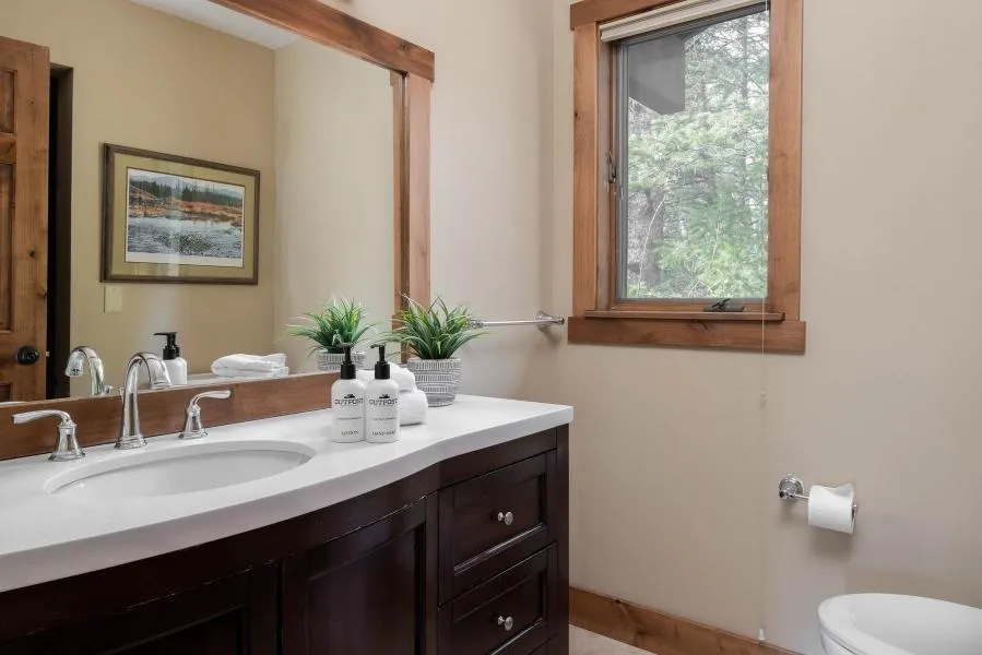 This 5 bedroom, ready-to-rent, ski chalet combines old world charm and modern access at the world class Jackson Hole Mountain Resort. Catch a ride from the Moose Creek ski lift in the winter, or start your hike from the backyard in the summer and walk home from dinner in Teton Village. Soak in the hot tub off the downstairs master bedroom and media room, which doubles as a 6th bedroom. Two other en-suite bedrooms, one with a private deck, are separated by the 3-story floor plan, providing privacy for guests. New stainless steel appliances will please the chef in the kitchen and heated floors add warmth. Curl up on the couch by the wood burning fireplace in the den - the perfect place for an afternoon nap. The intimate dining room has a table set for eight with woodsy views out the windows.