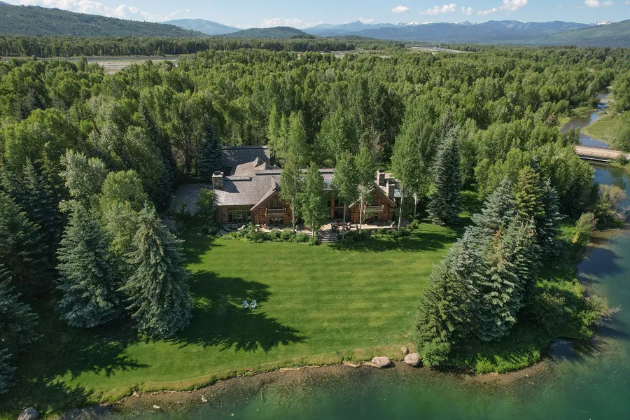 Perfect Grand Teton views will delight you from this 7,432 sq. ft. Canadian log residence fronting Tucker Lake. Set on 5.59 acres with manicured lawns, perennial flower beds, and mature trees, this Tucker Ranch property enjoys a convenient West Bank location and easement access to the banks of the Snake River. Featuring five bedrooms, 5.5 baths, and a separate 948 sq. ft., one-bedroom, one-bath guest house, the residence offers excellent separation of space with four guest suites on the second floor and a main floor primary suite with an office. The main living spaces and kitchen look out through large floor-to-ceiling windows to the beautiful views and setting. A spacious bonus room may be used as an additional bedroom, office, or workout space. Highlights include a dry bar, wet bar, laundry room, large patio and hot tub, twp attached garages, and generator.