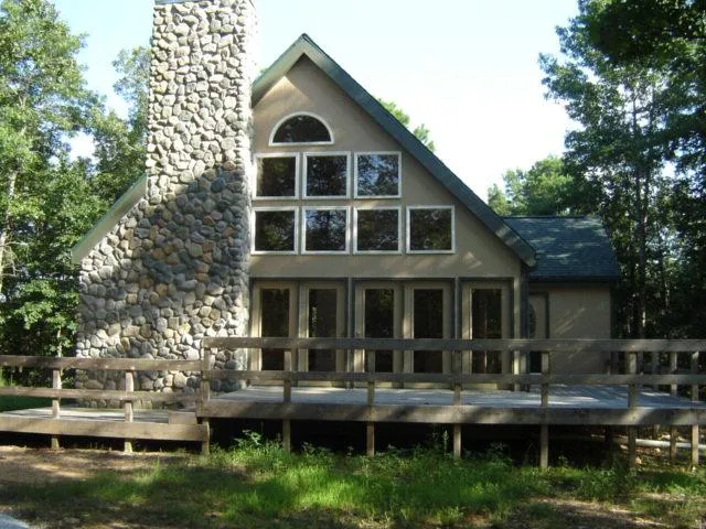 Built new in 2008 in equestrian community, 3 BRs, 3 bath, 1 1/2 story Contemporary style w/cathedral ceiling,lots of glass, balcony over great room, utility room, mud room,partial (660sq.ft.)basement,thermo-pane windows, central heat and air,gas-log rock fireplace,kitchen serving bar, architectural roof shingles,gutters & drains, wrap-around wood deck, all this on 10 acres secluded & wooded.