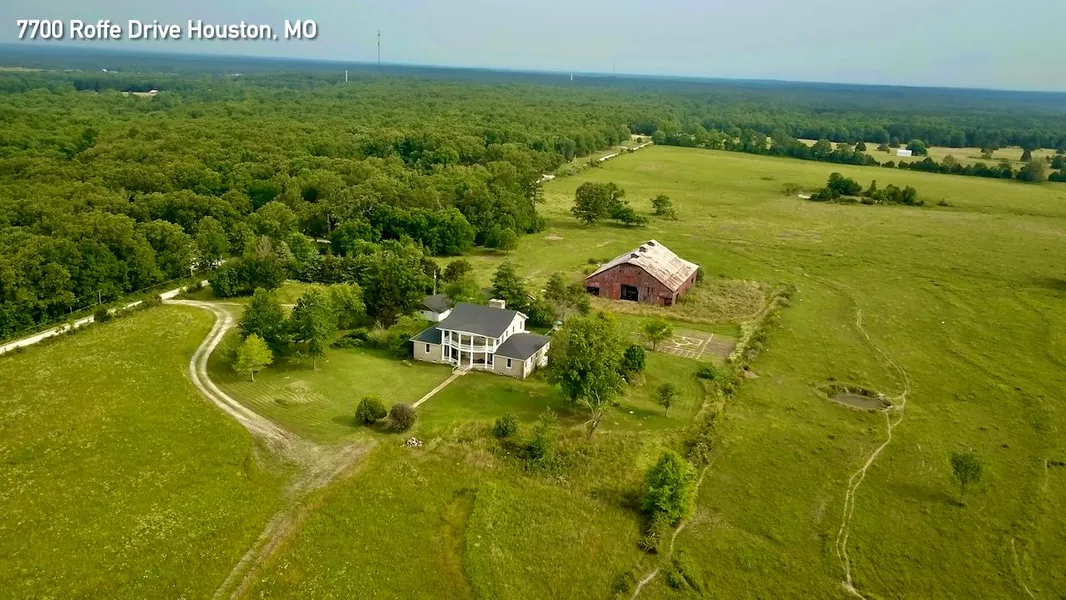 Houston, MO is the County Seat of Texas County Missouri and has a charming historical downtown. Big Piney River flows around Houston and has many public access points. The property fronts a paved road and dead-end gravel road on the side. It sits back off of the road with sweeping views of the countryside. Colonel Roffe picked this building site for a reason! The barn, pasture and ponds are just waiting for your horses or livestock!