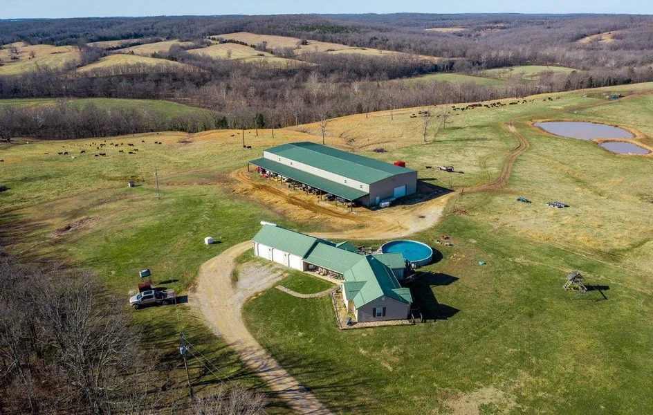 Buckners Roubidoux Ranch is located in Texas County, Missouri. 640 Acres with 275+ open acres consisting of amazing hill top views, and one mile of crystal clear spring fed Roubidoux creek. A large amount of mature walnut and white oak timber spread throughout the property. On site and overlooking the amazing view is a 2,000 sq ft 4 bed 3 bath home with 3 car garage, basement with working elevator & custom concrete countertops. This farm meets the checklist for everyone and the hunting is phenomenal this property holds turkey and deer year long and excellent opportunities are provided throughout the scattered timber sections ample stand and food plot locations have produced quality whitetail over the years. For the fisherman you won't find prettier water than the Roubidoux, spend your afternoons catching goggle eye and bass in the stream, or perhaps in one of the stocked ponds on the property one of which has a hunting cabin with electric close by. This property is accessible from the southwest corner on the other side of the river by a permit road off AE highway. Other features include an over 8,400 sq ft all steel shop w/ lean to, sleeping quarters , bathroom shower, plenty of storage inside for all your farm equipment & recreational fun. Property borders Mark Twain National Forest.