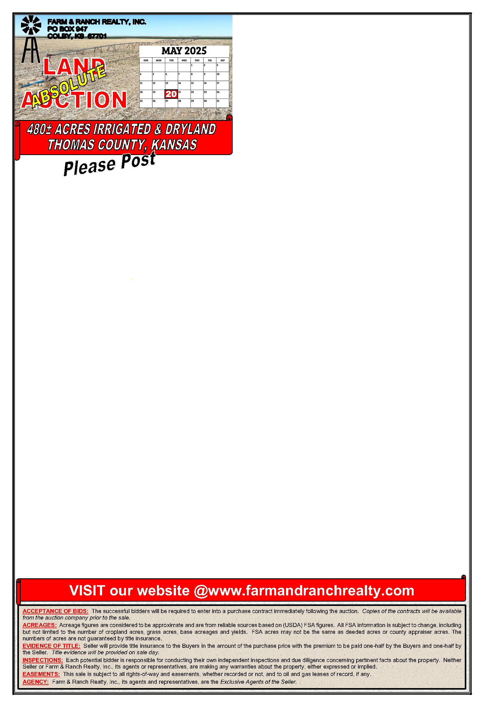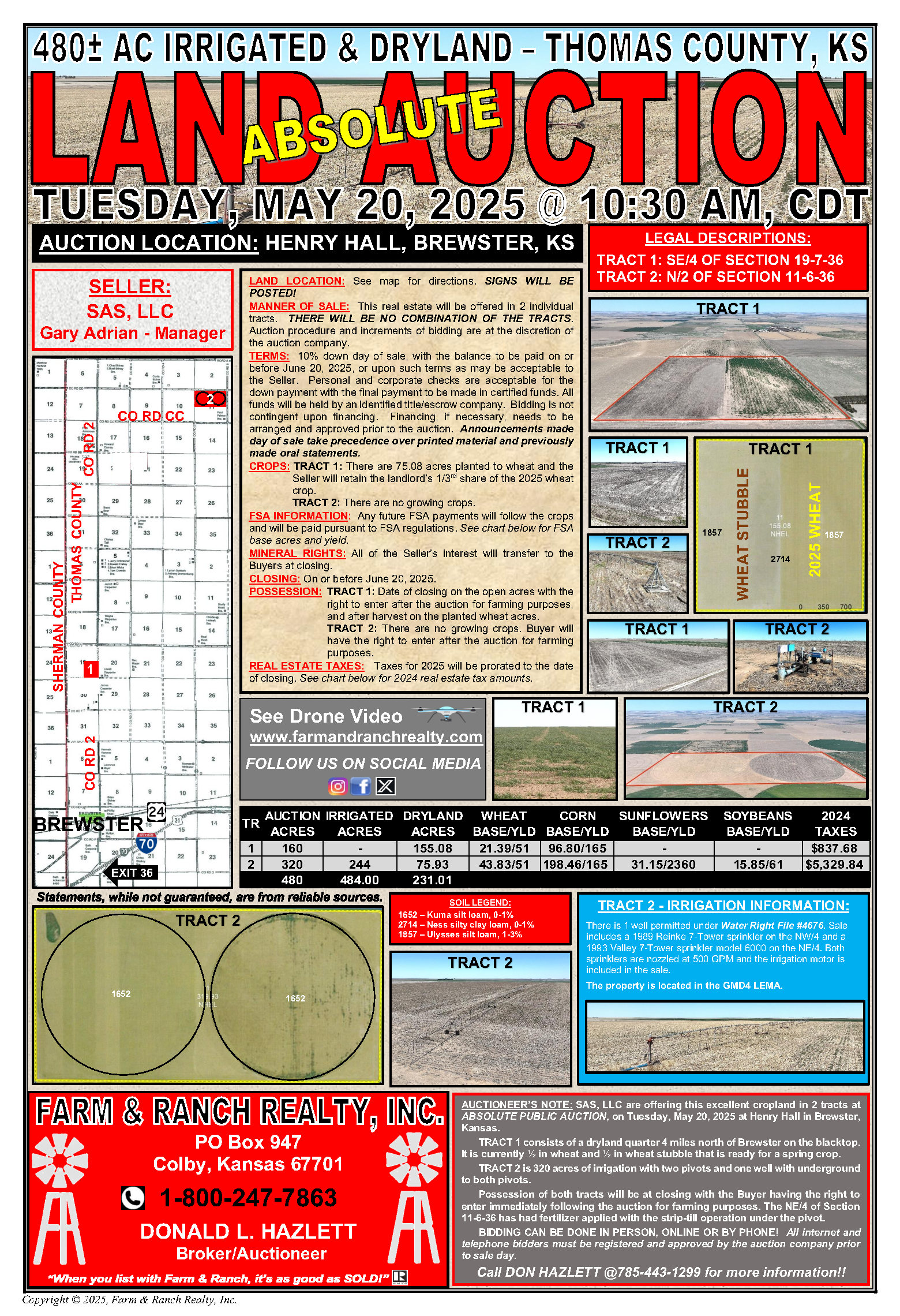 AUCTIONEERS NOTE: SAS, LLC are offering this excellent cropland in 2 tracts at ABSOLUTE PUBLIC AUCTION, on Tuesday, May 20, 2025 at Henry Hall in Brewster, Kansas.