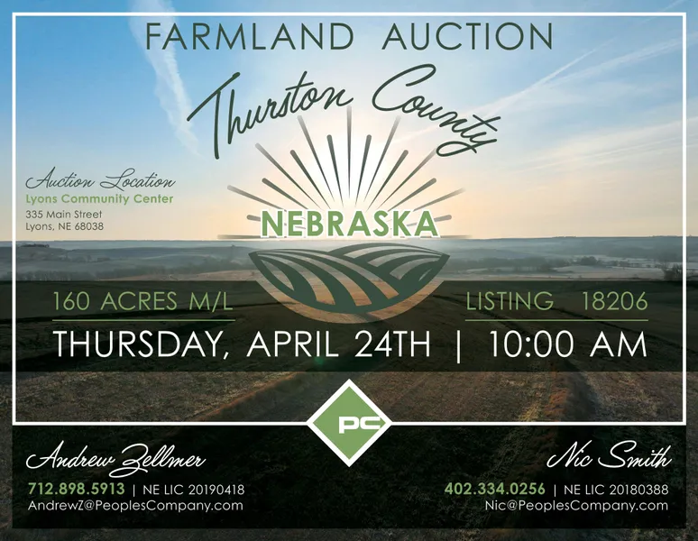 Thurston County, Nebraska Farmland Auction Mark your calendars for Thursday, April 24th at 10:00 AM CST! Peoples Company is pleased to represent the beneficiaries of the Jack Copple Estate in the sale of 160.00 acres M/L in Thurston County, Nebraska. The farm consists of two tracts of productive, tillable farmland located near Rosalie, Nebraska in Thurston County, Nebraska. The lease is open for the 2025 crop year. The Seller may grant early possession of the Property to the Buyer(s) after proof of earnest money deposit and execution of the Early Possession Lease Agreement.