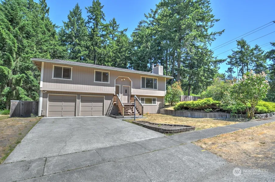 Wonderful split-level home on a corner lot, featuring nice updates and ample outdoor space with garden area. Enter to a warm and inviting interior that's been thoughtfully updated with modern touches. The main living area on the 2nd floor features an open floor plan that seamlessly blends the living room, dining room, and kitchen together. New floors and freshly painted interior. 3 bedrooms upstairs, including the primary, and 2 additional rooms for an office or bonus room are located downstairs, with a wood burning stove and 3/4 bath. This home features a metal shingle roof and slab foundation. Step out to the spacious covered deck, overlooking the back yard, with stairs down to the lower patio. Don't miss this great home!
