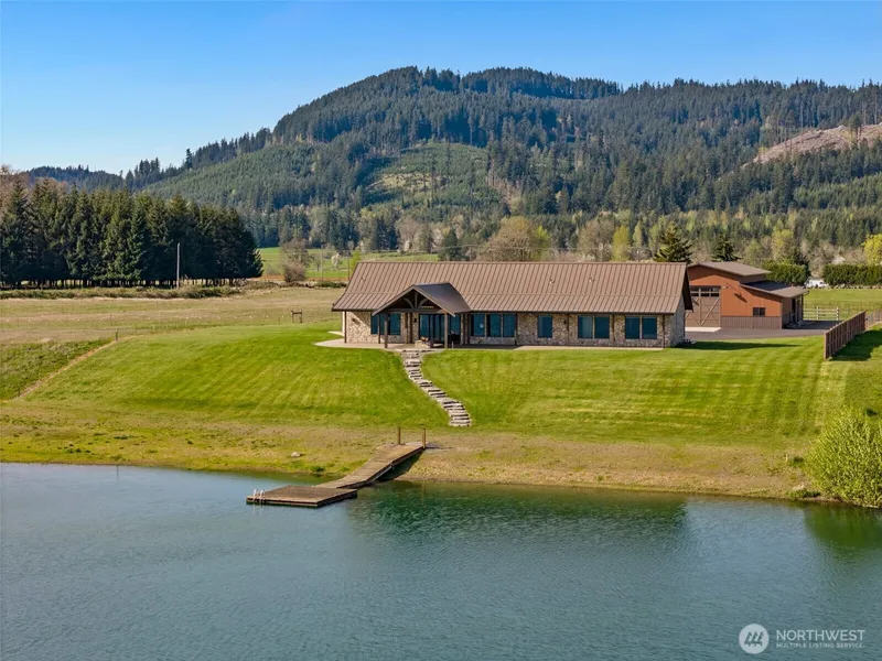 Incredible opportunity to own a private lakefront estate on acreage, offering stunning views, vibrant sunsets, & complete seclusion—all just 25 minutes from Olympia. This custom-built rambler seamlessly blends luxury and comfort w/open concept design, high-end finishes, heated concrete floors, gourmet kitchen, spacious primary suite & sauna room. Step outside to a heated covered patio w/firepit, overlooking the lake and your own private dock. This beautiful property features a 4,500 sq ft shop, gated entry, fenced pastures, & garden area—ideal for animals, hobbies, & recreational use. Enjoy fishing, kayaking, boating, & personal watercraft on Valley Lake, a 100-acre private lake w/ no public access. Luxury lakefront living at its finest!